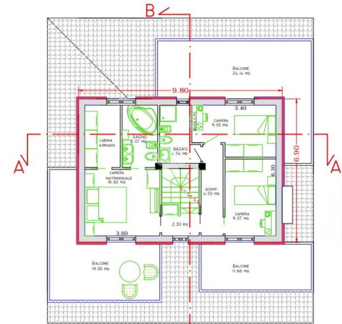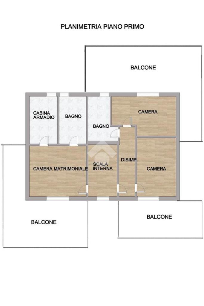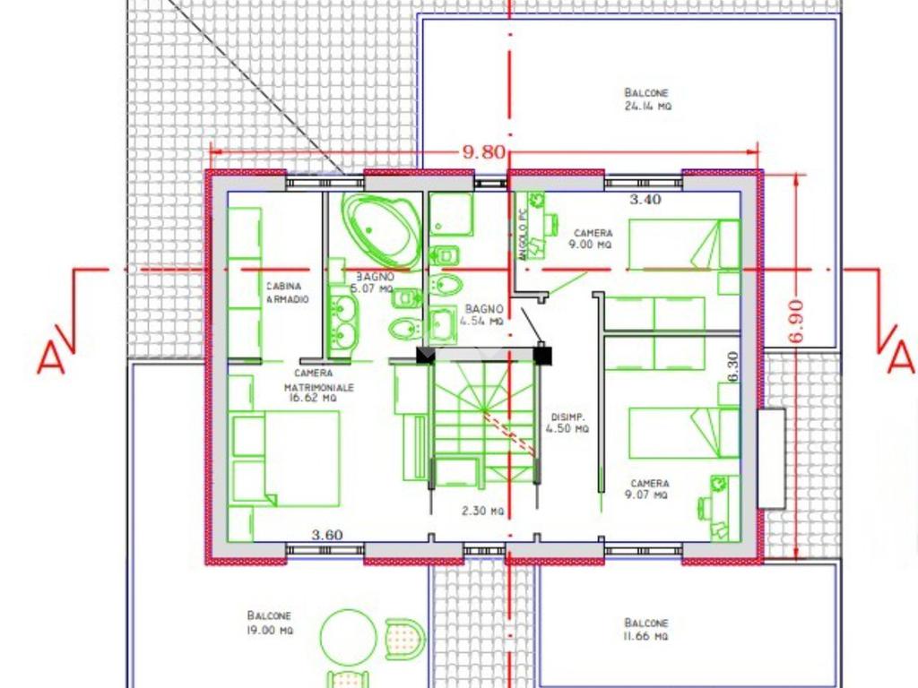 Al secondo piano, tre camere da letto, ciascuna con uscita su un ampio balcone, offrono spazi accoglienti e luminosi, completati da due bagni per garantire comfort e privacy.