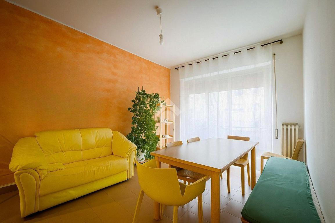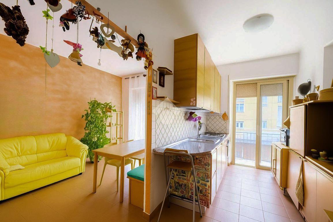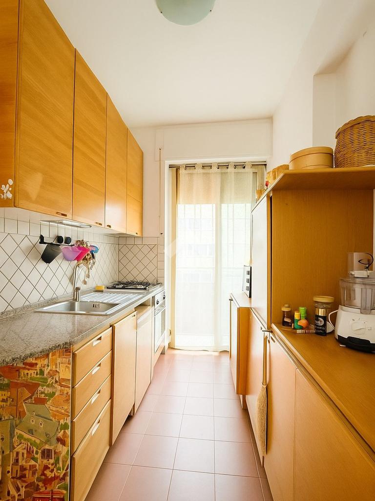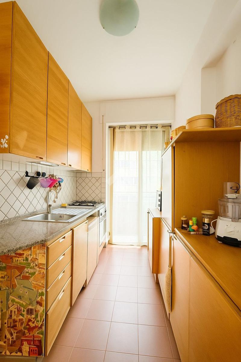 L'ampio soggiorno e la sala da pranzo con cucina si aprono su un balcone in parte verandato, dove è possibile godere del sole e che ospita anche la lavatrice per maggiore comodità.