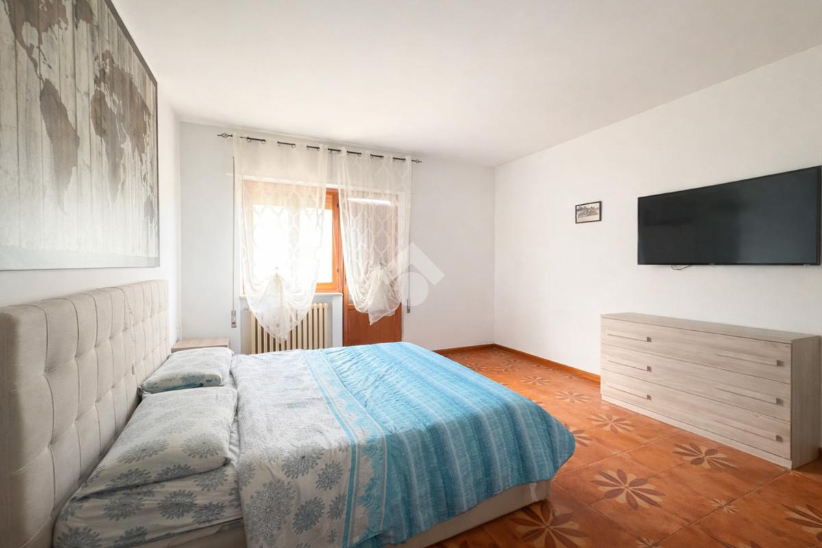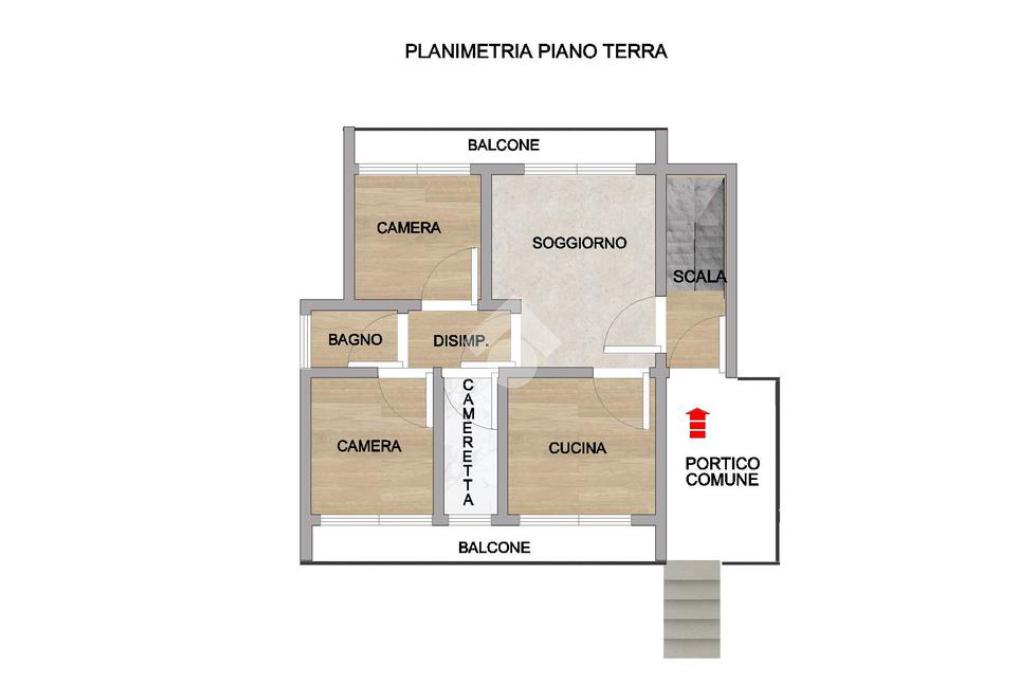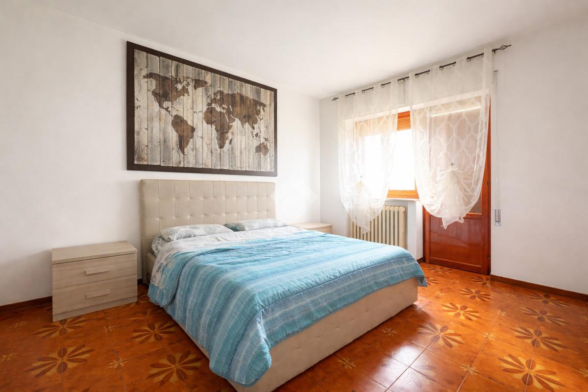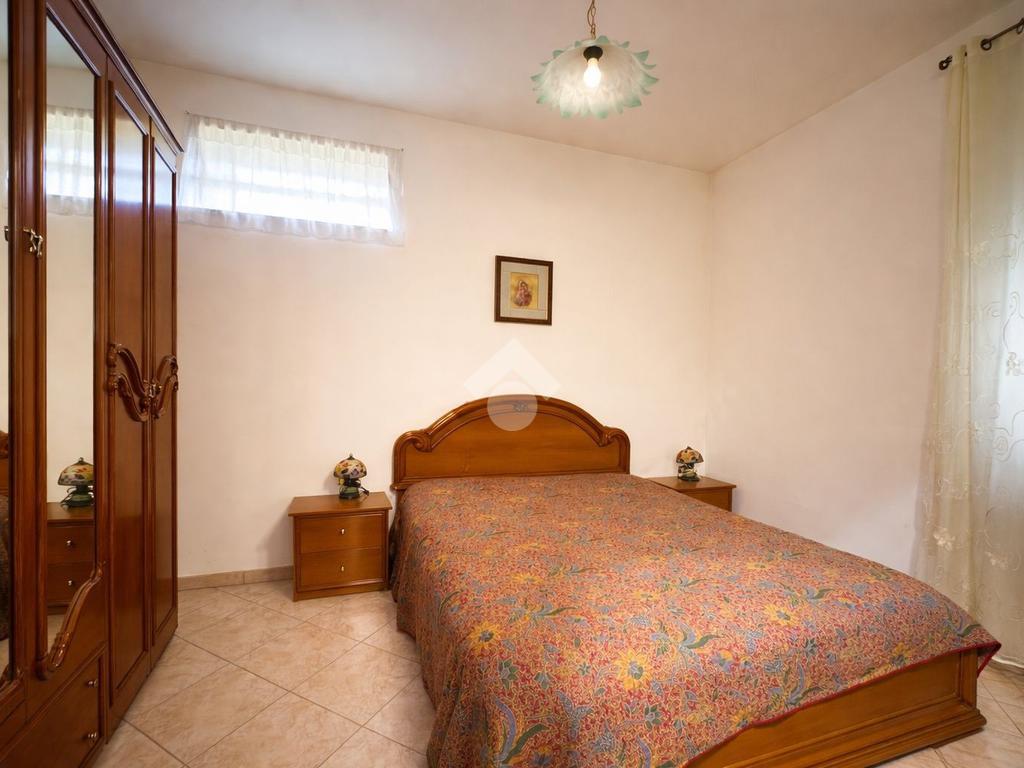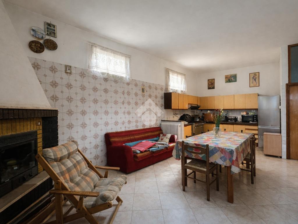 L’ingresso avviene attraverso un comodo portico comune che conduce all’abitazione, composta da un luminoso soggiorno con accesso diretto agli spazi esterni, una cucina abitabile arricchita da camino, due ampie camere matrimoniali, una cameretta e un bagno ristrutturato, finestrato e dotato di doccia.