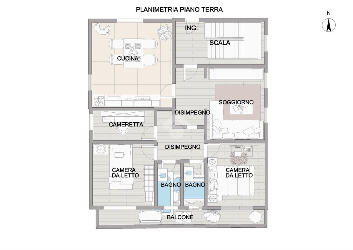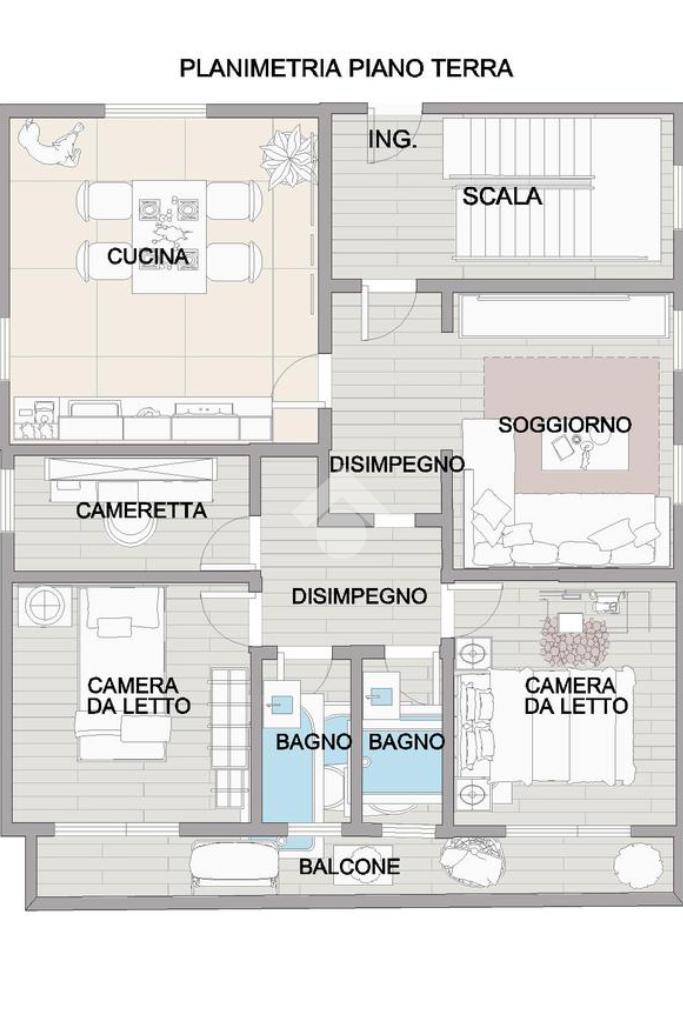 Al piano terra si trova un appartamento indipendente composto da un'ampissima e luminosissima cucina, un soggiorno accogliente, due camere da letto con affaccio su balcone e una cameretta, oltre a un doppio bagno con uno dotato di vasca e l'altro di doccia. L'appartamento presenta finestre in legno con vetro termico, zanzariere e doppi infissi in alluminio, pavimentazione in marmo, bagni riammodernati, esterni e balconi ristrutturati, tutti elementi che contribuiscono al fascino dell'abitazione.