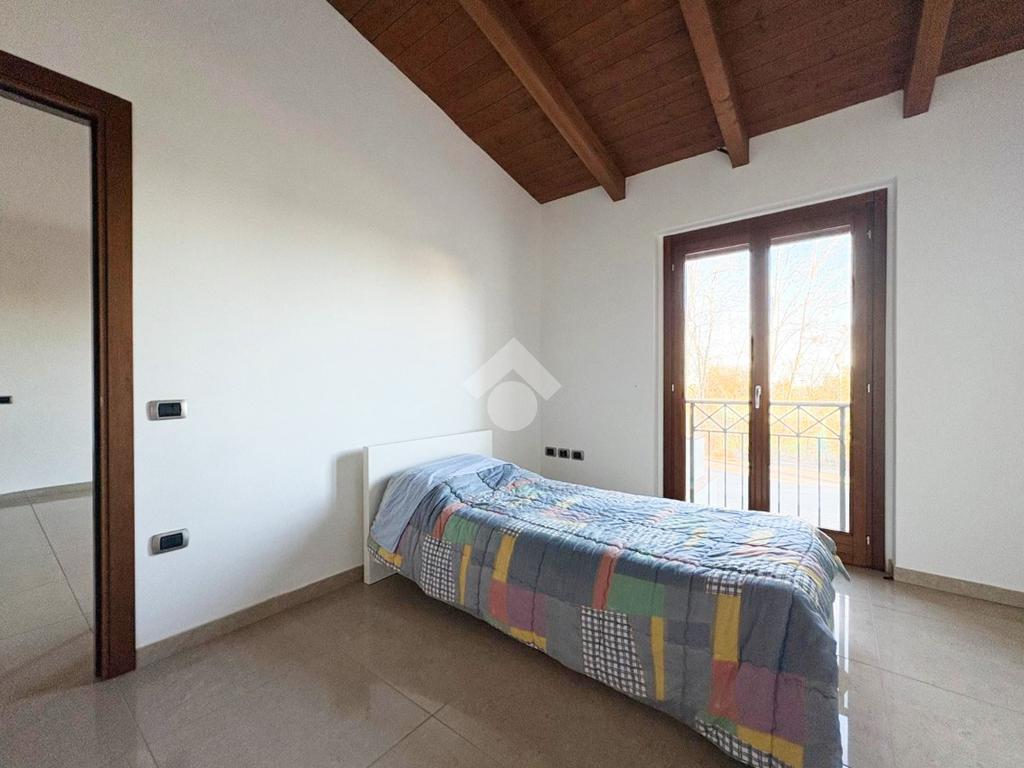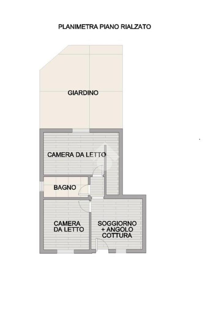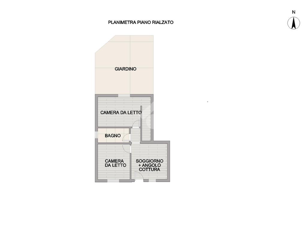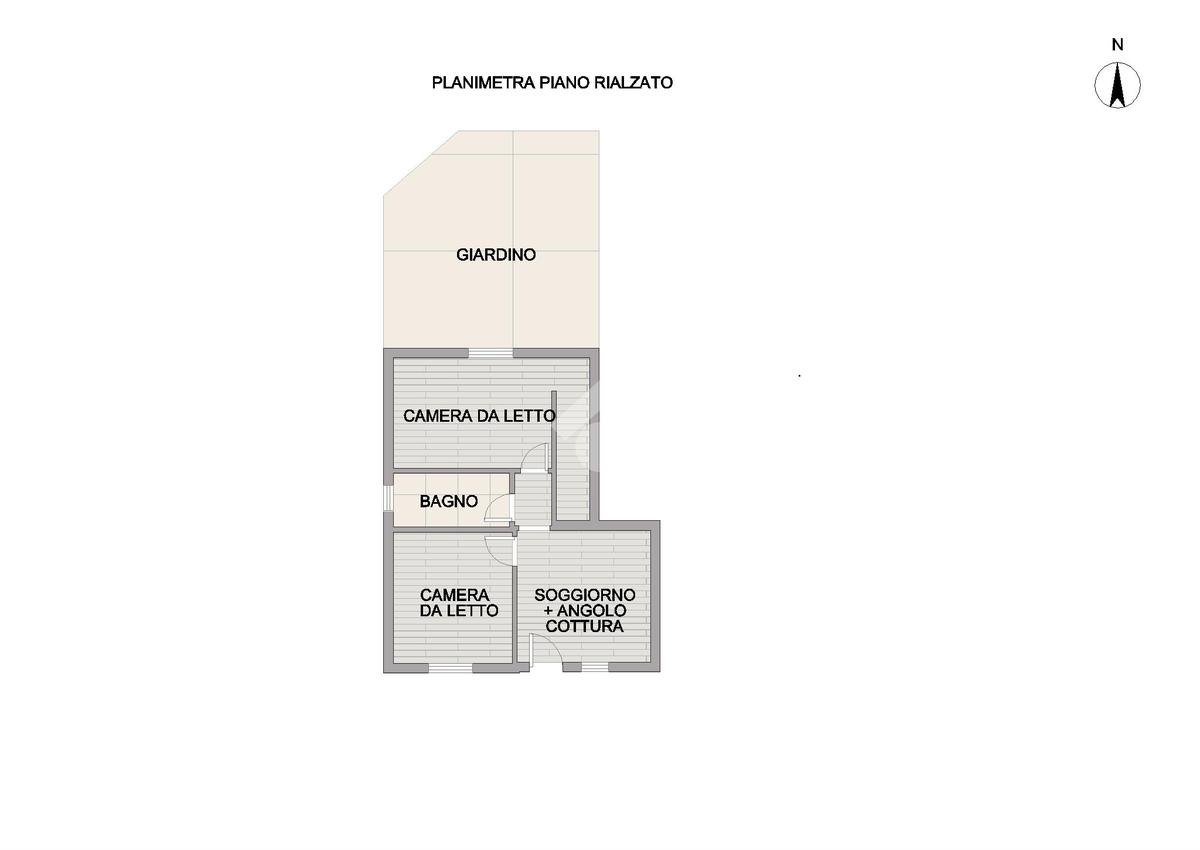 Una scala interna conduce al piano rialzato con un soggiorno luminoso dotato di angolo cottura e due camere da letto, una con travi in legno a vista e l'altra con uscita diretta sul giardino posteriore. Il bagno, finestrato e dotato di vasca, completa la dotazione del piano.