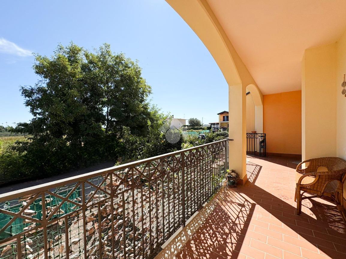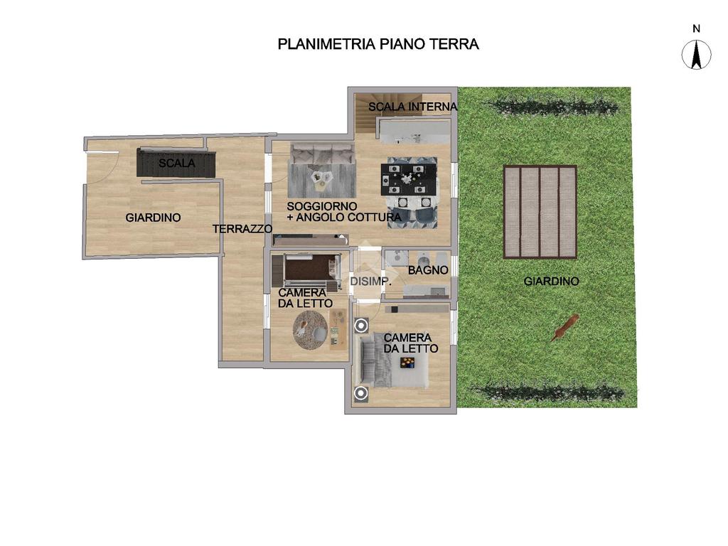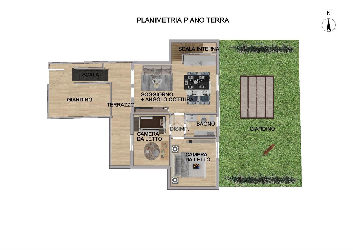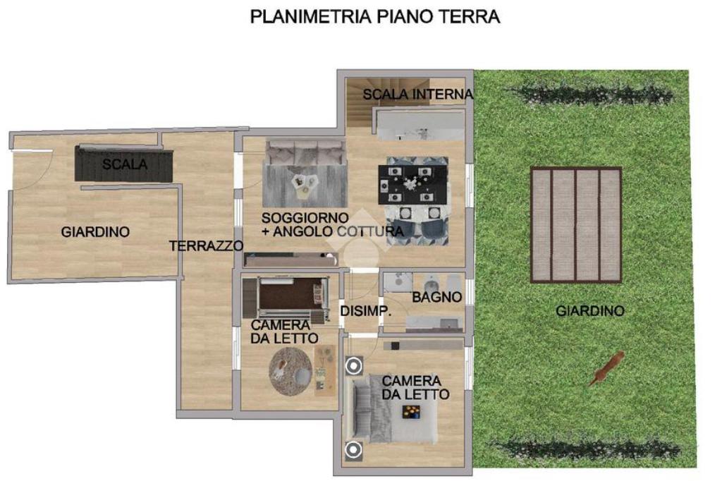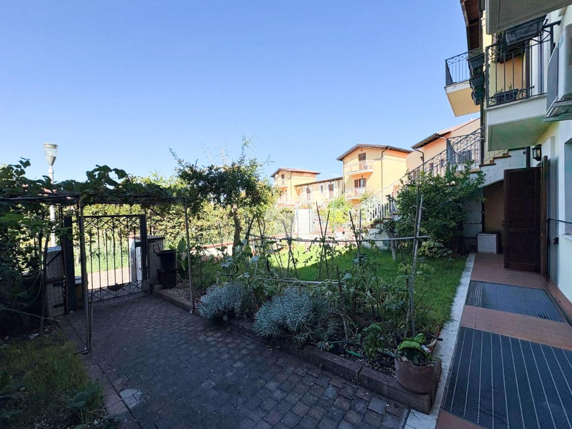 Al piano terra, il soggiorno e la cucina open space si aprono con affaccio al giardino, creando un ambiente luminoso e accogliente ideale per la vita quotidiana e per momenti conviviali. Le due comode camere da letto offrono spazi piacevoli, di cui una con affaccio al giardino e l'altra sul terrazzo garantendo privacy. Il bagno è dotato di un'ampia doccia e l'aria condizionata al corridoio assicura un clima confortevole in ogni stagione.